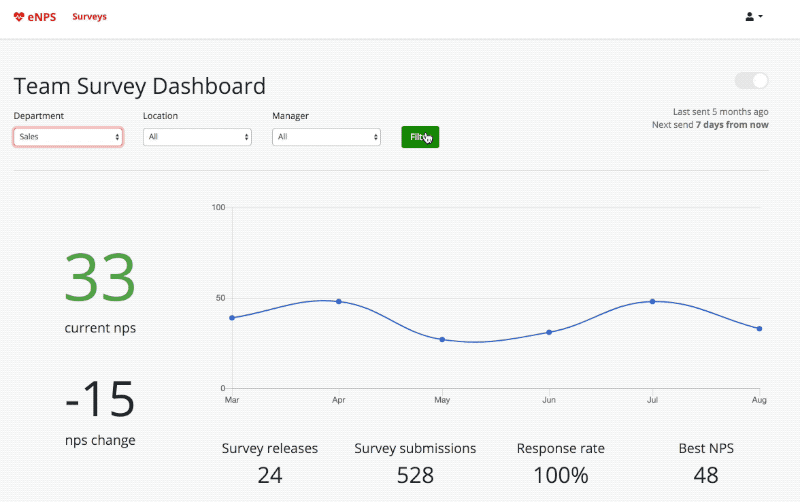 Filter eNPS scores by location, department, and manager. Send via text message or email. Schedule surveys to automatically send monthly or quarterly. Keep surveys strictly anonymous.